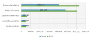 Tossina Botulinica e Acido Ialuronico si sono confermati gli iniettivi più richiesti anche nel 2020, in particolare nella fascia di età 35-50 anni, mentre i peeling chimici hanno guadagnato il terzo posto tra le procedure più richieste, seguiti dai trattamenti per la rimozione definitiva dei peli superflui e per il ringiovanimento del viso.